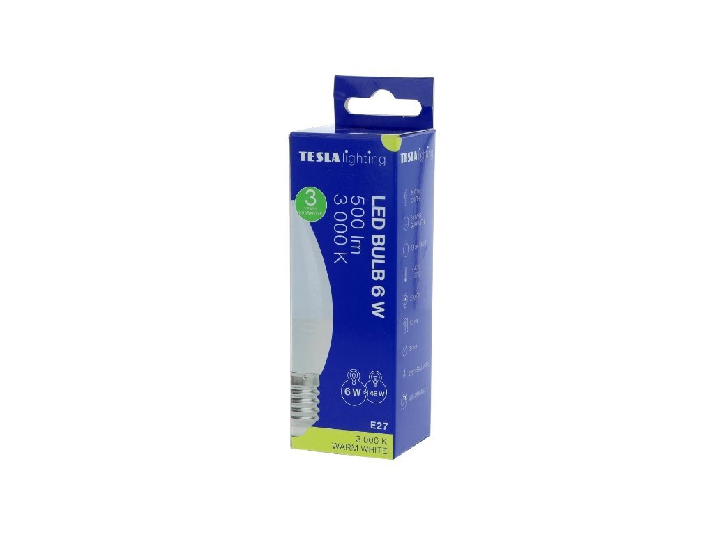 LED žárovka od tradiční české společnosti s více než 100letou historií TESLA Lighting. Tato žárovka je určena pro svítidla s paticí E27. Vyzařuje teplé bílé světlo s chromatičností 3000K a svítivostí 470lm, které je ideální pro pracovní a běžné činnosti, proto lze tuto žárovku doporučit zejména do pracoven, šaten a koupelen. Díky moderní a efektivní LED technologii nahradí s příkonem 4,9W klasickou 50W žárovku a ušetří Vám až 85 % nákladů na energii. Jistě také potěší dlouhá životnost až 25 000 hodin a 15 000 spínacích cyklů. Kvalita produktu je podpořena rozšířenou zárukou na 3 roky.