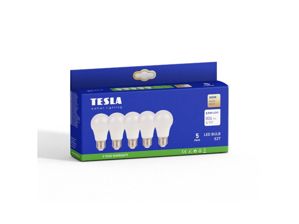 Tesla - LED žárovka BULB E27, 8,5W, 230V, 806lm, 25 000h, 3000K teplá bílá, 220st 5ks v balení