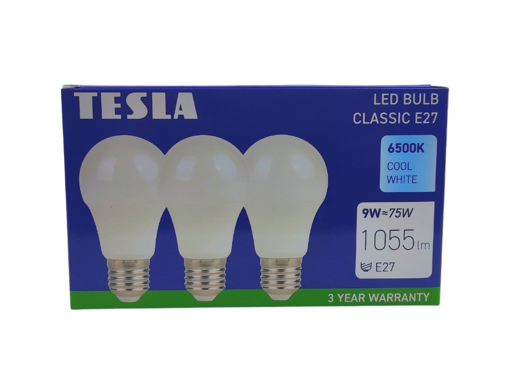 Tesla - LED žárovka BULB E27, 9W, 230V, 1055lm, 25 000h, 6500K studená bílá, 220st 3ks v balení