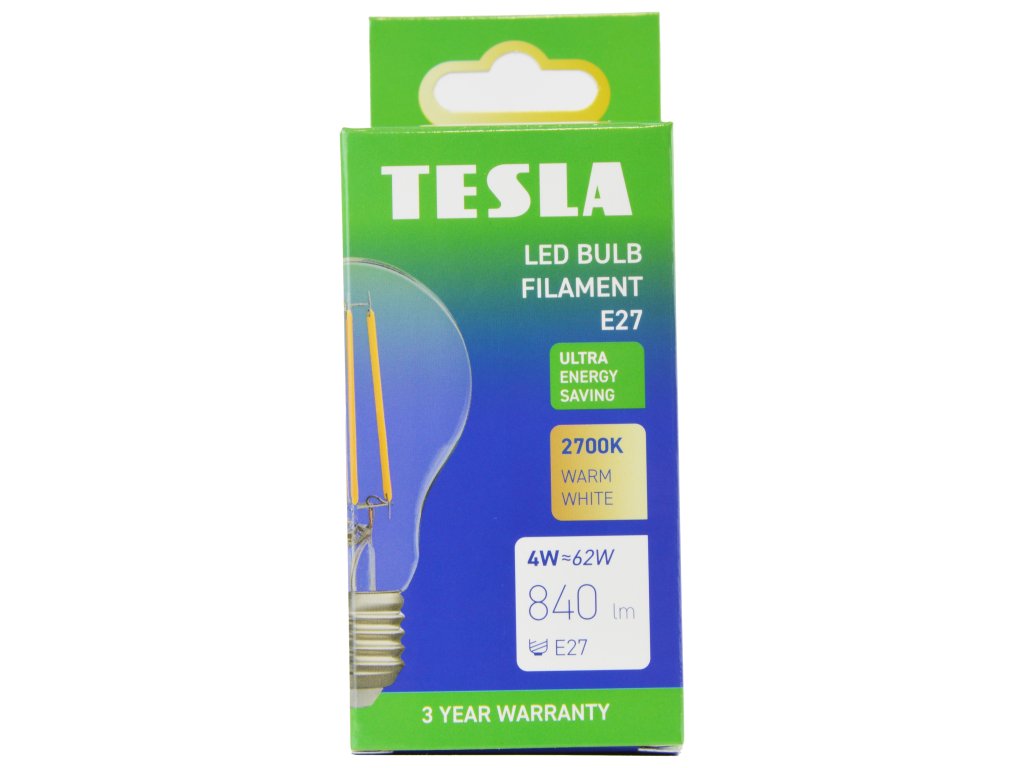 Tesla - LED žárovka FILAMENT A class, E27, 4W, 840lm, 2700K teplá bílá, 360st, čirá, 230V, 25 000h