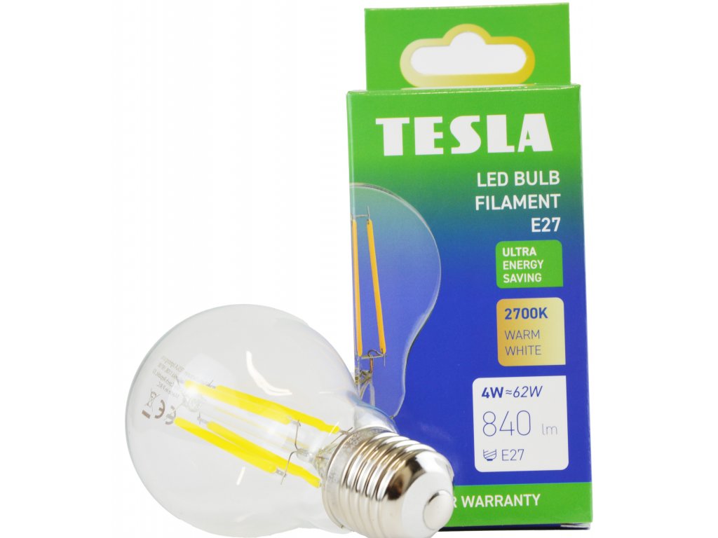 LED žárovka od tradiční české společnosti s více než 100letou historií TESLA Lighting. Tato žárovka je určena pro svítidla s paticí E27. Vyzařuje teplé bílé světlo s chromatičností 2700K a svítivostí 840lm, které je ideální na relaxaci a odpočinek, proto lze tuto žárovku doporučit zejména do dětských pokojů, obývacích pokojů a ložnic. Díky moderní a efektivní LED technologii nahradí s příkonem 4W klasickou 62W žárovku a ušetří Vám až 85 % nákladů na energii. Jistě také potěší dlouhá životnost až 25 000 hodin a 15 000 spínacích cyklů. Kvalita produktu je podpořena rozšířenou zárukou na 3 roky.