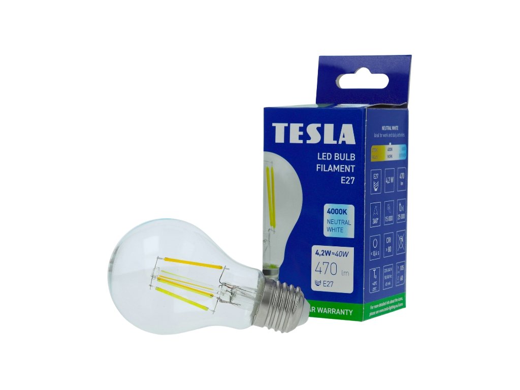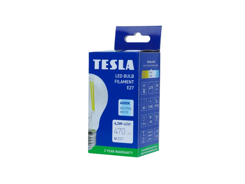 Tesla - LED žárovka FILAMENT RETRO BULB, E27, 4,2W, 230V, 470lm, 25 000h, 4000K denní bílá, 360st,čirá
