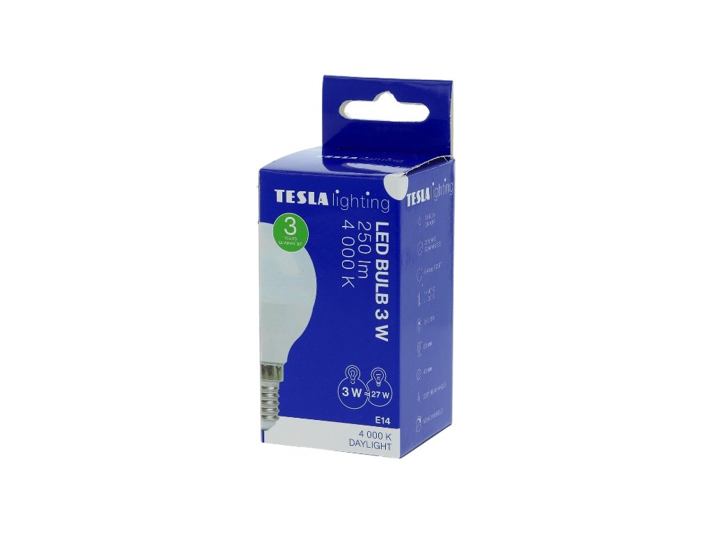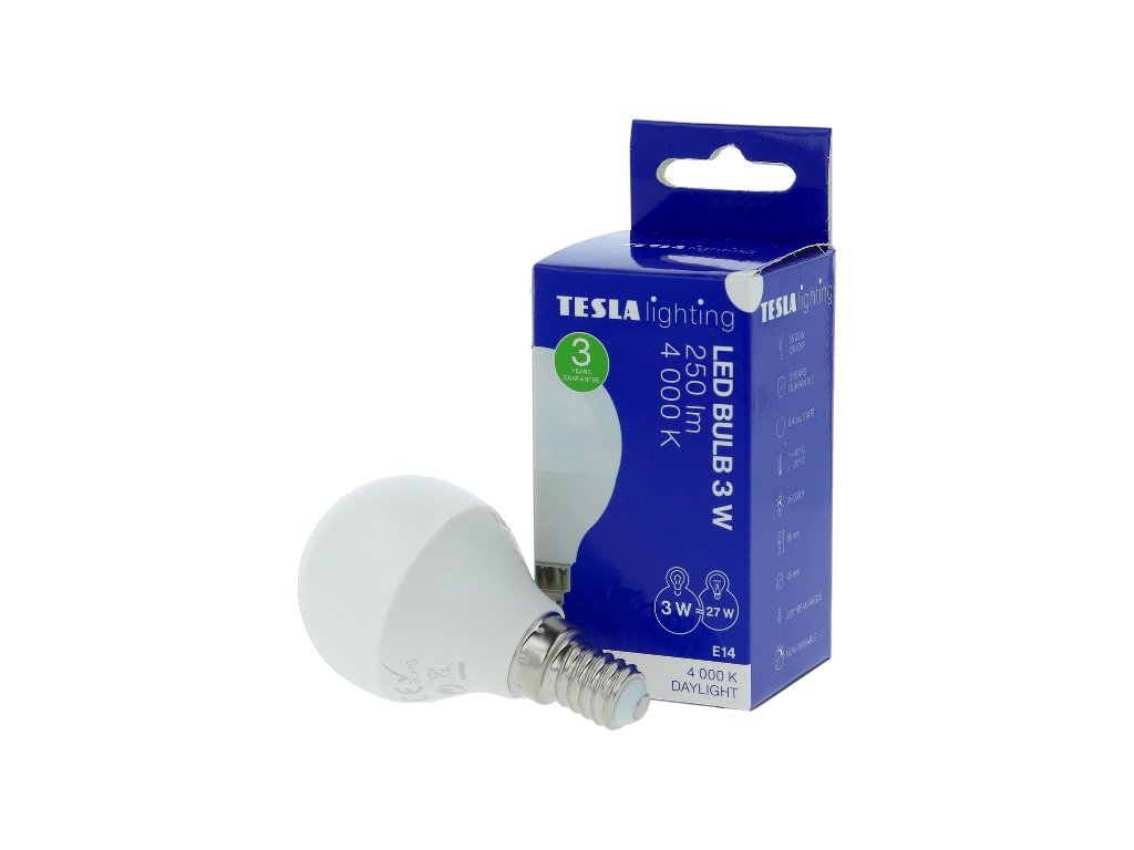 LED žárovka od tradiční české společnosti s více než 100letou historií TESLA lighting. Tato žárovka je určena pro svítidla s paticí E14. Vyzařuje denní bílé světlo s chromatičností 4000K a svítivostí 250 lm, které je ideální pro pracovní a běžné činnosti, proto lze tuto žárovku doporučit zejména do pracoven, šaten a koupelen. Díky moderní a efektivní LED technologii nahradí s příkonem 3 W klasickou 25W žárovku a ušetří Vám až 85 % nákladů na energii. Jistě také potěší dlouhá životnost až 25 000 hodin a 15 000 spínacích cyklů. Kvalita produktu je podpořena rozšířenou zárukou na 3 roky.