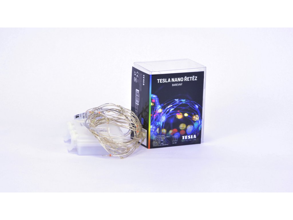 Tesla - nano řetěz 50LED, RGB, 5m + 30cm kabel, 3x AA baterie, časovač, IP44
