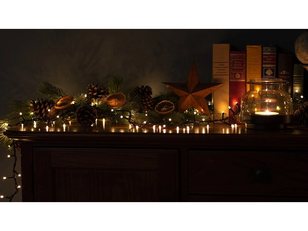 LED dekorativní řetěz od společnosti TESLA lighting, 100 LED diod, ovladač s 8 funkcemi, teplota světla 3000K, délka osvětleného kabelu 10m, délka přívodního kabelu 5m, vhodné pro vnitřní i venkovní použití - třída ochrany: IP44 (venkovní použití).