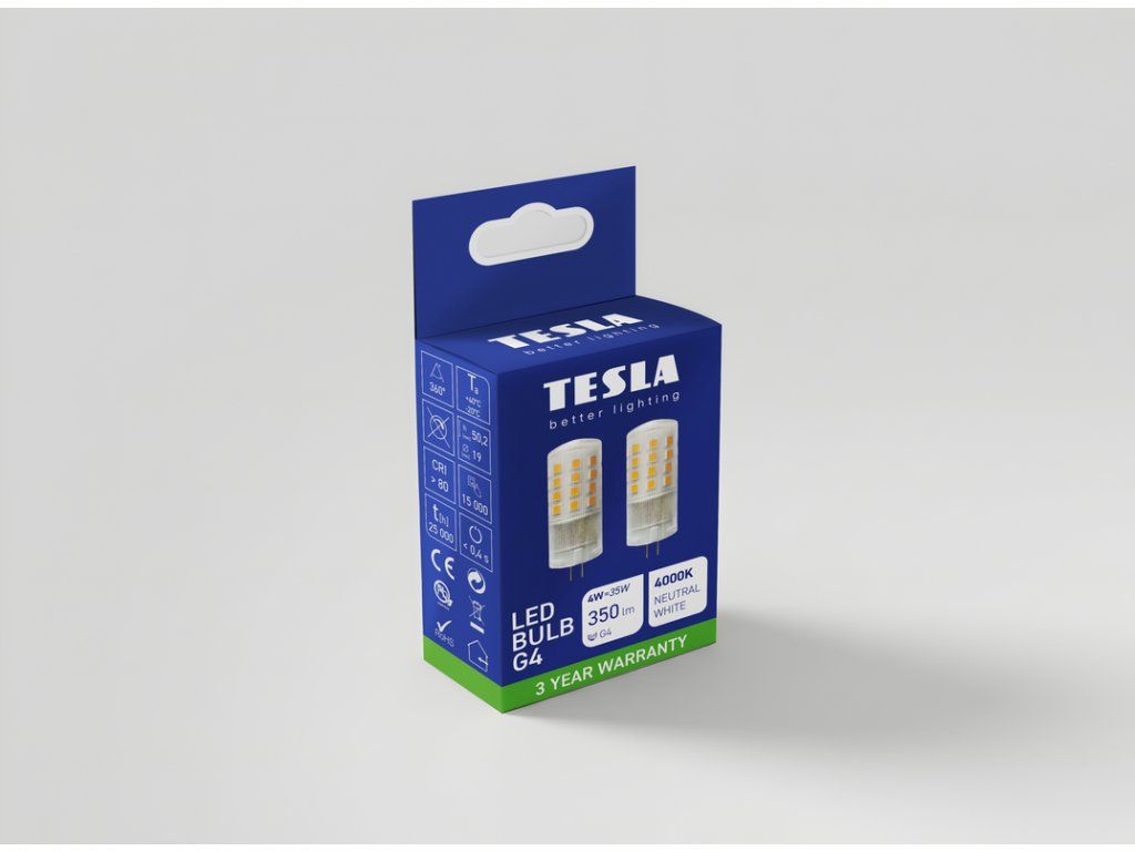 LED žárovka od tradiční české společnosti s více než 100letou historií TESLA lighting. Tato žárovka je určena pro svítidla s paticí G4. Vyzařuje denní bílé světlo s chromatičností 4000K a svítivostí 350 lm, které je ideální pro pracovní a běžné činnosti, proto lze tuto žárovku doporučit zejména do pracoven, šaten a koupelen. Díky moderní a efektivní LED technologii nahradí s příkonem 4 W klasickou 35 W žárovku a ušetří Vám až 85 % nákladů na energii. Jistě také potěší dlouhá životnost až 25 000 hodin a 15 000 spínacích cyklů. Kvalita produktu je podpořena rozšířenou zárukou na 3 roky.